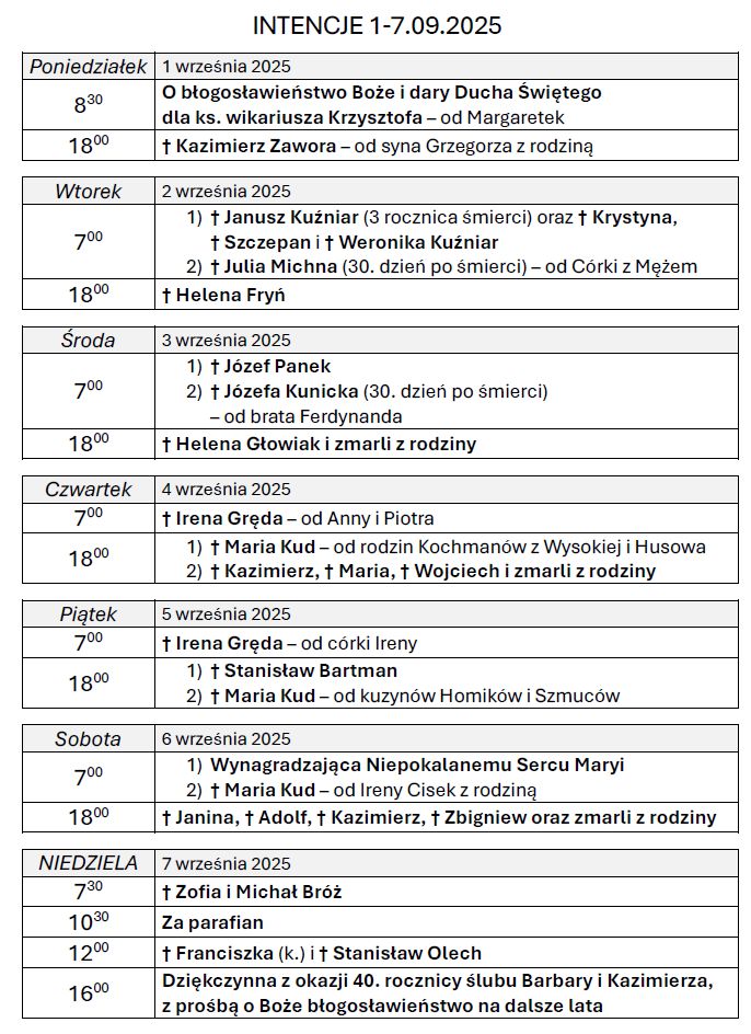 - Zapraszamy na adorację Najświętszego Sakramentu w czwartek od 17.00 oraz na I Piątkową po Mszy św. wieczornej do godz. 21.00.